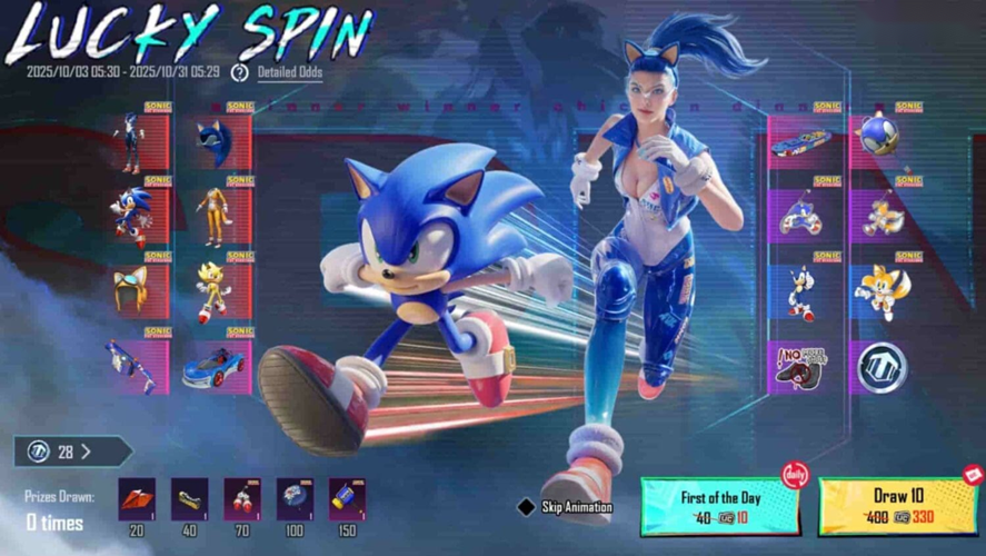 To participate in the Sonic lucky spin and claim your prizes, you'll need to use UC, the in-game currency. A single spin costs 40 UC, while a 10-spin package is available for 330 UC. Keep an eye on the prize draw counter located at the bottom left of the screen, as it also provides opportunities to earn additional rewards during the event.